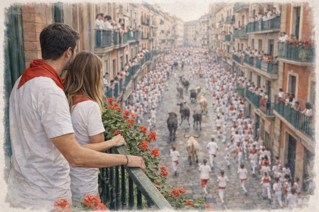 Nuestros balcones están situados en pleno centro de la calle Estafeta, uno de los puntos más emocionantes del recorrido. Desde aquí vivirás el encierro en su máximo nivel de intensidad.